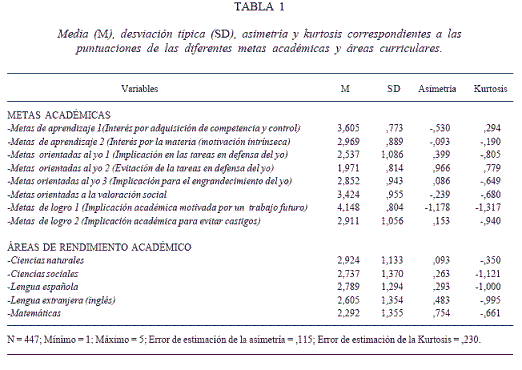 En la Tabla 1 se aportan los datos correspondientes a las medias, desviación típica, asimetría y kurtosis de cada una de las variables de metas y rendimiento académico. El análisis de los datos de distribución de las puntuaciones indican que, en general, tanto la asimetría como la kurtosis se encuentran dentro de valores aceptables. En concreto, únicamente un valor de la asimetría y tres en kurtosis sobrepasan mínimamente el valor de 1.