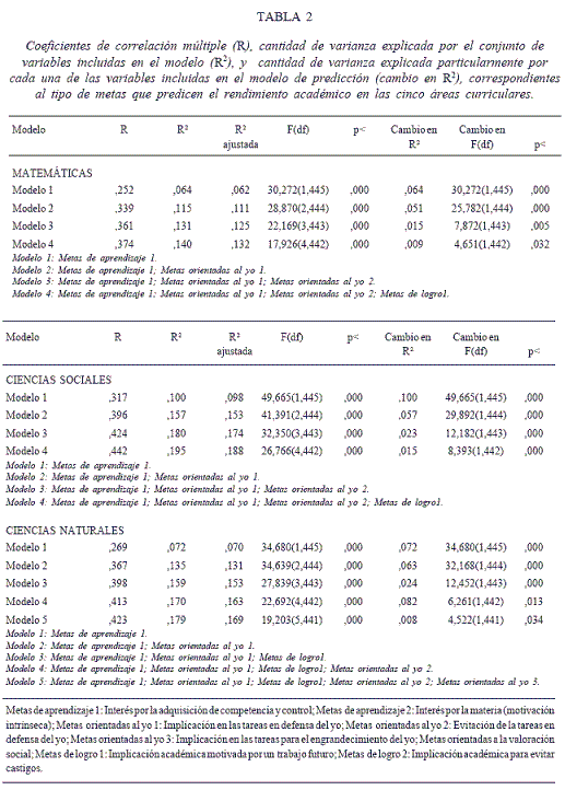 Se han llevado a cabo cinco análisis de regresión múltiple (por el método de paso a paso) con el fin de conocer qué tipo de metas académicas son predictoras del rendimiento en cada una de las cinco áreas académicas analizadas en este estudio, así como la relevancia diferencial de cada una de ellas dentro de la ecuación de regresión. En la Tabla 2 se aportan los datos correspondientes a los cinco análisis de regresión, en los que las metas se tratan como variables predictoras y las cinco áreas de rendimiento como variables criterio.
