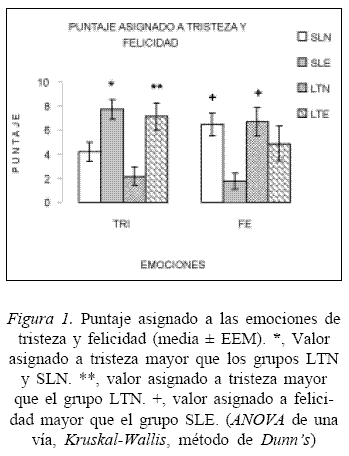 Escala de emociones básicas (Figura 1 ). De manera general los grupos no se diferenciaron con respecto a la atribución de puntajes a las emociones de sorpresa (H = 1,811), miedo (H = 4,554) y rabia (H = 4,290). Sin embargo, el ANOVA de una vía reveló una diferencia entre los grupos comparados para la atribución emocional de tristeza y felicidad (H = 16,858; H = 14,601, respectivamente). Con relación a la emoción de tristeza, se evidenció que el grupo SLE obtuvo una mayor puntuación en comparación con el grupo SLN y LTN (Q = 2,982; Q = 3,444, respectivamente). Por otra parte se encontró que el grupo LTE obtuvo un mayor valor en relación con el grupo LTN (Q = 2,644). Adicionalmente, para la emoción de felicidad se encontró que los grupos SLN y LTN puntuaron más alto comparados con el grupo SLE (Q = 3,375; Q = 2,847 respectivamente). En los análisis intragrupo de los pacientes lobectomizados, no se evidenciaron diferencias entre los valores asignados por los grupos LTN vs. LTE.