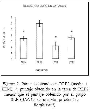Recuerdo libre fase dos (RLF2). El ANOVA de una vía demostró que los grupos se diferenciaron con relación al RLF2 (F[3,44] = 10,244).Según la prueba t de Bonferroni, el grupo SLE recordó libremente un mayor número de detalles de la historia en relación con los grupos SLN, LTN y LTE (t = 4,086; t = 4,818; t = 3,96, respectivamente) (Figura 2 ), demostrando que los pacientes lobectomizados no mostraron el efecto de potenciación mnemónica inducido por alertamiento emocional.