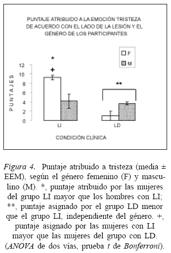 Prueba auditivo-visual. Para los análisis estadísticos, se conformaron los siguientes grupos: mujeres y hombres con lesión derecha (LD) y mujeres y hombres con lesión izquierda (LI). De manera general, no se encontraron diferencias estadísticas con respecto a la atribución de valor en la escala de valor emocional y el puntaje en el CRF2 atribuibles al lado de la lesión y el género de los participantes. Sin embargo a pesar de que no se haya encontrado diferencias estadísticas con respecto a las demás emociones básicas, el ANOVA de dos vías reveló que el lado de la lesión alteró la atribución de "peso" a la emoción de tristeza (F[1,12] = 7,286) y que hubo interacción entre el lado de la lesión y el género de los participantes (F[1,12] = 5,783). La prueba t de Bonferroni (Figura 4 ) reveló que los participantes del grupo LD atribuyeron un menor puntaje a la emoción Tristeza que los participantes del grupo LI (t = 2,699). Dentro del grupo con LI, las mujeres atribuyeron un mayor valor que los hombres a esta emoción (t = 2,791), sin embargo, las mujeres con lesión del lado derecho atribuyeron un valor más bajo que las mujeres con lesión del lado izquierdo (t = 3,263).