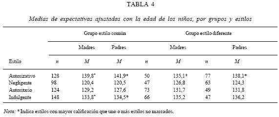 En cuanto a la identificación y comparación de las expectativas por estilos, encontramos que las expectativas no sólo fueron diferentes entre estilos, sino que el patrón fue consistente por género, en las parejas con estilo común y en las que no compartían estilo. En el caso de las parejas con estilo común autorizativo, ellas mostraron expectativas significativamente más altas que las de padres autoritarios y las de negligentes. Es interesante notar que las parejas indulgentes tuvieron expectativas intermedias entre las de parejas autorizativas y autoritarias, pero fueron más altas que las de negligentes. En madres y padres con estilo diferente encontramos un patrón de diferencias menos claro, pero semejante al anterior; las únicas diferencias significativas fueron entre ambos padres autorizativos comparados con los negligentes. Estos resultados están de acuerdo con los hallazgos de Baumrind (1971) acerca de que los padres autoritarios tienen expectativas irreales. Pero los resultados coinciden parcialmente, ya que en la población estudiada, y tal vez en la población iberoamericana, los padres con "preocupación", o que demandan más del desarrollo de sus niños corresponden a los autorizativos y a los indulgentes. En contraste, los autoritarios tal vez ejercen mayor control porque "esperan" poco de sus niños, siendo el caso extremo el de los negligentes que esperan aún menos de ellos y hacen esfuerzos mínimos para favorecer la auto-regulación en sus niños. Estos resultados son importantes porque evidencias acumuladas por décadas indican que las expectativas irreales sobre las capacidades de los niños están fuertemente relacionadas con el maltrato infantil (Rickel & Becker, 1997), y sorprende que esta dimensión no sea incluida en los estudios específicos sobre estilos de crianza.
