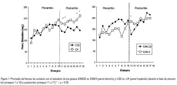 La Figura 1 también muestra los resultados de los 7 ensayos de la fase de postcambio. Se observa una disminución abrupta del tiempo de contacto con el bebedero de los grupos que recibieron la devaluación del reforzador, EAN/32 y C/32. Sin embargo, también puede observarse una recuperación más rápida del contraste en los animales del grupo EAN/32 que en los del grupo C/32, a pesar de que la curva de recuperación de este último grupo es distinta a la que se observa con mayor frecuencia en la literatura. Los análisis estadísticos confirman estas observaciones. Un ANOVA mixto de Contraste x Tratamiento x Ensayo (11 a 17), mostró efectos significativos de Contraste, F (1, 23) = 7.03, p < 0.01; de Ensayo, F (6,138) = 9.02, p < 0.01; de Tratamiento x Ensayo, F (6,138) = 2.32, p < 0.04 y de la triple interacción Contraste x Tratamiento x Ensayo, F (6,138) = 2.82, p < 0.0001. Para establecer la fuente de las interacciones significativas, se realizó ANOVA para cada ensayo. Los ensayos 11, 12, 15, 16 y 17 arrojaron diferencias significativas (p < 0.001). Los principales resultados significativos de los test de comparación de pares con la prueba LSD de Fisher de cada ensayo, fueron los siguientes. Ensayo 11: C/32 vs. C/4, EAN/32 vs. EAN/4; p < 0.001. Ensayo 12: las diferencias se hallaron solamente entre C/32 vs. C/4; p < 0.03. Ensayo 15: C/32 vs. C/4, EAN/32 vs. C/32; p < 0.02. Ensayo 16: EAN/32 vs. C/32; p < 0.002. Ensayo 17: EAN/32 vs. C/32, C/32 vs. C/4; p < 0.02.