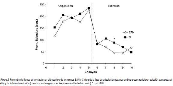 La Figura 2 muestra el promedio de tiempo de contacto con el bebedero de los grupos EAN y C en las fases de adquisición y de extinción.