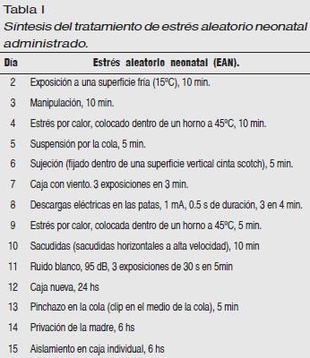 El estrés aleatorio neonatal (EAN, Tabla 1) consiste en estimulaciones impredecibles y repetitivas de las crías durante los primeros días de vida (González, Rodríguez, Cabrera & Fóscolo, 1990). Estos autores compararon el estrés aleatorio neonatal, la manipulación de las crías durante los días 2 a 15, y los controles no estresados en varias respuestas emocionales en su vida adulta. Los resultados de este trabajo sugieren que el EAN produce mayor estabilidad emocional en la vida adulta que la manipulación sola y que la ausencia de tratamiento neonatal. Por ejemplo, el EAN atenuó el aumento de prolactina y de corticosterona, y mejoró el déficit en el desempeño en una prueba de natación forzada después que los animales estuvieron expuestos al frío o a descargas eléctricas impredecibles e incontrolables durante dos semanas, comparados con sujetos que sólo fueron manipulados y controles no tratados. Además, la manipulación neonatal fue menos efectiva que el EAN en reducir el déficit comportamental observado en la prueba de natación forzada, y menos eficaz en evitar las alteraciones que provocaron las descargas eléctricas impredecibles en el ciclo estral de las ratas hembras (González, Rodríguez, Cabrera & Fóscolo, 1991).
