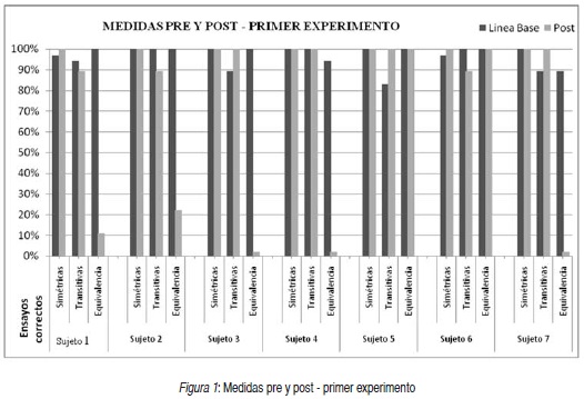 En la Figura 1 se muestra la comparación entre la línea base vs. la medida post (es decir después de aplicar la V.I) del primer experimento. En ella se puede observar que sólo 2 sujetos lograron cambiar su patrón de respuesta en las relaciones de equivalencia (sujetos 5 y 6), y sus relaciones simétricas y transitivas no se afectaron de una manera relevante. Los sujetos 1 y 2 cumplieron un número de ensayos muy bajo en el nuevo patrón, por tanto, no se considera que hayan cumplido el criterio para determinar que se obtuvo algún tipo de cambio. Los sujetos 3, 4 y 7 no modificaron sus relaciones de equivalencia ni en una baja proporción. Por tanto, en estos cinco sujetos no se vieron afectadas sus relaciones simétricas o transitivas.