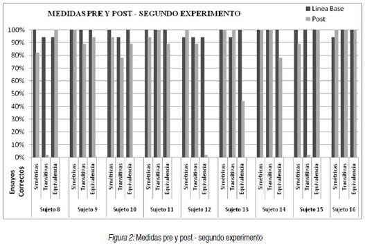 En la Figura 2 se ve la comparación entre la línea base vs. la medida post. En este experimento, 6 de 9 sujetos lograron cambiar su patrón de respuesta en las relaciones de equivalencia. Al sujeto 14 sólo le faltaron dos puntos para llegar al criterio de ejecución esperado en el cambio de patrón. En los sujetos 8 y 15, que lograron el cambio al 100% en el patrón de respuesta de sus relaciones de equivalencia, se evidenció un efecto negativo en sus respuestas a las relaciones transitivas; cada uno obtuvo sólo 2 ensayos correctos en dichas relaciones. Así mismo, en estos dos sujetos se observa una disminución en sus respuestas correctas a las relaciones simétricas de la medida post. En los sujetos 9 y 10, también se ve afectado el número de respuestas correctas en las relaciones transitivas.