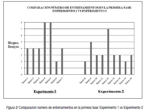 En primera instancia, se comentará el número de entrenamientos necesarios para lograr el criterio de ejecución que permitía a los sujetos pasar a la evaluación de las derivadas. Durante el Experimento 1, en el que los estímulos utilizados fueron sílabas sin sentido, los sujetos necesitaron un mayor número de ensayos que en el Experimento 2. La media del primer grupo (Experimento 1) fue de 4.8 ensayos, y la del segundo grupo (Experimento 2) fue de 3.4 ensayos. La Figura 3 se ve graficada esta diferencia. El sujeto 5, en el Experimento 1, y el sujeto 12 en el Experimento 2, fueron casos extremos que no siguieron esta tendencia. Cabe destacar que en el Experimento 2 ningún sujeto requirió fases de re-entrenamiento.