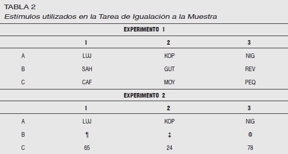 La secuencia experimental fue exactamente igual a la del Experimento 1, sólo hubo algunos cambios en el procedimiento de Igualación a la Muestra, específicamente en los estímulos utilizados (Tabla 2).