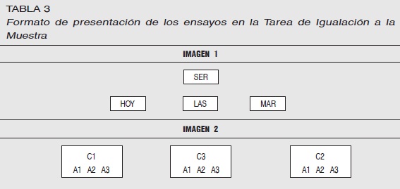 Los sujetos desconocían los niveles alfa-numéricos correspondientes a cada sílaba. Las instrucciones y los reforzadores eran dados en el mismo formato que las sílabas, pero su tamaño era de 24 puntos. A diferencia de los estímulos, los reforzadores eran de color azul para la palabra bien, y en color rojo para la palabra mal. Inicialmente, el programa pedía al sujeto registrar su nombre, edad y a qué se dedicaba, a continuación aparecía la siguiente instrucción: "El siguiente ejercicio consta de dos Partes: En la primera parte, vas a hacer un ejercicio en el que tienes que relacionar sílabas sin sentido". Luego, el programa realizaba un ejemplo de lo que el sujeto debía hacer, de la siguiente forma: "Una de las sílabas aparecerá encerrada en un rectángulo en la parte superior de la pantalla, siempre tendrás que elegir, pinchando con el ratón, una de las tres sílabas que aparecen en la parte inferior". (Imagen 1 en la Tabla 3).