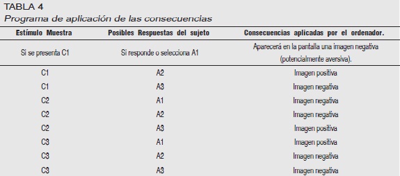 Sin embargo, al responder a dichas relaciones de la forma en que había aprendido a derivar durante el entrenamiento, aparecían como consecuencias imágenes negativas (como accidentes de coches, genocidios, niños golpeados, animales maltratados, personas vomitando o con heridas abiertas, etc.) que le generaban malestar al sujeto. Si el sujeto cambiaba su patrón de respuesta (marco relacional de oposición), aparecían imágenes positivas (paisajes relajantes, gente sonriendo, cachorros de animales, arco iris, etc.). Dichas imágenes fueron seleccionadas por medio del buscador de imágenes por Internet de Google, las cuales se sometieron a evaluación por medio de cuatro jueces para determinar si realmente cumplían con los criterios necesarios para la prueba. Así mismo, los resultados del estudio piloto también fueron acordes con dichos criterios; es decir, las personas al ver las imágenes aversivas, generaban emociones negativas como asco, temor, ansiedad etc., mientras que las imágenes positivas generaban emociones positivas en los participantes como alegría, tranquilidad, risa, entre otras. Al terminar las tareas experimentales, a los participantes se les preguntó qué emociones les habían generado las imágenes que veían, y solo dos de los sujetos reportaron estar muy familiarizados con las imágenes de tipo aversivo por lo que se tuvieron que retirar del experimento. El resto de los participantes manifestó emociones acordes a lo esperado según el tipo de imágenes. Las imágenes fueron presentadas ocupando la pantalla completa del ordenador. Las contingencias dadas se presentan en la Tabla 4: