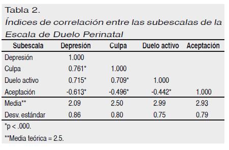 Las subescalas de depresión, culpa y duelo activo correlacionaron positiva y significativamente entre sí, y negativamente con la subescala de aceptación. Los índices de correlación obtenidos entre las subescalas del instrumento, así como las medias y desviaciones estándar para cada una de ellas, se muestran en la Tabla 2. Los puntajes más bajos correspondieron a la subescala de depresión y los más altos, a la de duelo activo.