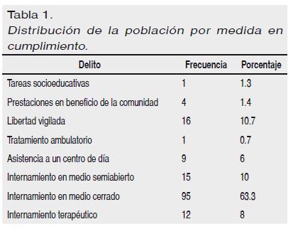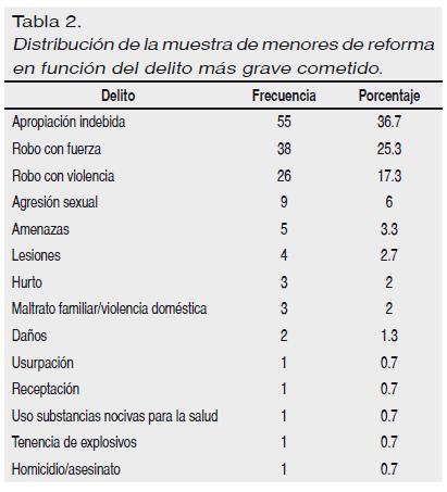 Se tomó una muestra de 150 menores de reforma que estaban cumpliendo una medida judicial (ver en la Tabla 1 la distribución) con edades comprendidas entre los 14 y los 19 años (M = 16.91; Sx = 0.91) de los que 133 (88.7%) eran varones y 17 (11.3%) mujeres. Todos eran reincidentes: con 2 medidas, 125 (83.3%); con 3, 10 (6.7%); con 4, 10 (6.7%); y con 5, 5 (3.3%). Por delito más grave cometido, predomina la apropiación indebida (55 menores), el robo con fuerza (38 casos) y el robo con violencia (26 contingencias) (véase la distribución en la Tabla 2).
