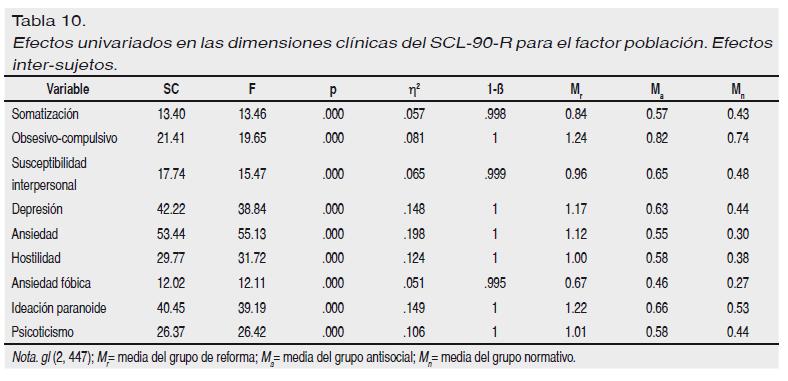 Por lo que se refiere a los efectos univariados (ver Tabla 10) hallamos que las poblaciones se diferencian en las nueve dimensiones clínicas medidas: somatización, obsesivo-compulsivo, susceptibilidad interpersonal, depresión, ansiedad, hostilidad, ansiedad fóbica, ideación paranoide y psicoticismo. Los efectos simples a posteriori (p < .05) aclaran que los menores de reforma presentan más sintomatología propia de somatización, obsesióncompulsión, susceptibilidad interpersonal, depresión, ansiedad, hostilidad, ansiedad fóbica, paranoia y psicoticismo que las poblaciones antisocial y normativa; y que la población antisocial informa de más síntomas de hostilidad y ansiedad que la población normativa. En suma, los menores de poblaciones desviadas (reforma y antisocial) señalan que padecen más sintomatología clínica que la población normativa, y, dentro de éstas, la delictiva que la antisocial, esto es, los resultados apoyan un efecto escalada (normativa, antisocial y delictiva).