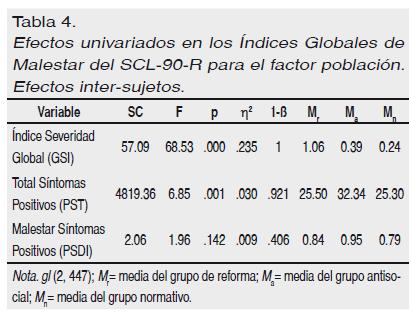 Por lo que se refiere a la simulación, los resultados de un MANOVA sobre las medidas de la (di)simulación del SCL-90-R con el factor población (reforma, antisocial y normativa), pusieron de manifiesto un efecto multivariado significativo para el factor población, F multivariada (6, 892) = 34.29; p < .001; η2 = .187; 1-ß = 1. Los efectos univariados (ver Tabla 4) evidenciaron diferencias en el Índice de Severidad Global (GSI) y el Total de Síntomas Positivos (PST) que, los efectos simples a posteriori (p < .05), concretaron en que los menores de reforma informaban de una mayor severidad de daño clínico que los antisociales y los normativos; y que los menores antisociales advertían de más síntomas positivos que los de reforma y los normativos. En resumen, los resultados avalan la tendencia a la manipulación de las respuestas (mentira y sobresimulación) en las poblaciones de menores antisociales y de reforma.