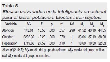 Realizado un MANOVA sobre la medida de la inteligencia emocional con el factor población (reforma, antisocial y normativa), los resultados mostraron un efecto significativo, en la inteligencia emocional, para el factor población, F multivariada (6, 892) = 15.92; p < .001; η2 = .097; 1-ß = 1, que da cuenta del 9.7% de la varianza.
