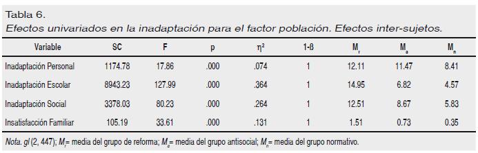 Efectuado un MANOVA sobre la inadaptación con el factor población (reforma, antisocial y normativa), los resultados revelaron un efecto significativo, en la inadaptación, para el factor población, Fmultivariada (8, 890) = 31.40; p < .001; η2 = .220; 1-ß = 1. En suma, el factor población media diferencias significativas en la inadaptación de los menores, explicando el 22% de la varianza.