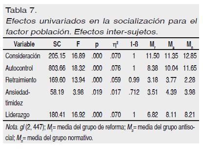 Realizado un MANOVA sobre la socialización con el factor población (reforma, antisocial y normativa), los resultados exhibieron un efecto significativo, en la socialización terciado por el factor población, Fmultivariada (10, 888)= 11.42; p < .001; η2 = .114; 1-ß= 1; explicando el 11.4% de la varianza.