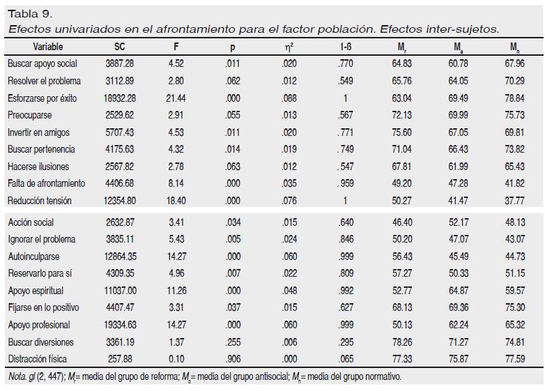 Los efectos univariados aclararon (véase la Tabla 9) que las diferencias producidas por el factor población se ceñían a las estrategias de afrontamiento " buscar apoyo social", "esforzarse y tener éxito", "invertir en tener amigos", "buscar pertenencia", "falta de afrontamiento", "reducción de la tensión", "acción social", "ignorar el problema", "autoinculparse", "reservarse para sí", "búsqueda de apoyo espiritual", "fijarse en lo positivo" y "búsqueda de apoyo profesional". Los efectos simples a posteriori explicitan (p < .05) que la población antisocial busca menos apoyo social (compartir el problema con otros y buscar apoyo en su resolución) que la normativa; que las poblaciones de reforma y antisocial se esfuerzan menos por tener éxito (realización de conductas de trabajo, esfuerzo y realización personal) que la normativa, y la de reforma que la antisocial; que la población de reforma invierte más en amigos (búsqueda de relaciones personales íntimas) que la antisocial; que la población antisocial busca menos pertenencia (esto es, preocupación e interés por las relaciones con los demás y por lo que los otros piensan de uno) que la normativa; que las poblaciones de reforma y antisocial presentan una mayor falta de afrontamiento (es decir, incapacidad personal para tratar el problema y el desarrollo de síntomas psicosomáticos) que la normativa; que la población de reforma afronta, en mayor medida, los problemas mediante la reducción de la tensión (es decir, sentirse mejor mediante acciones que reduzcan la tensión como llorar, gritar, evadirse) que la antisocial y normativa; que la población de reforma acude menos a la etrategia de "acción social" (dejar que otros conozcan el problema y tratar de conseguir ayuda escribiendo peticiones u organizando actividades) que antisocial; que la población de reforma tiende más a "ignorar el problema" (rechazar conscientemente el problema) que la normativa; que la población de reforma "se autoinculpa" (autorresponsabilizarse de los problemas) más que la antisocial y normativa; que la población de reforma "se reserva para sí" (tendencia a aislarse de los demás y a impedir que se conozcan sus preocupaciones) más los problemas que la antisocial y normativa; que la población de reforma busca menos "apoyo espritual" (empleo de la oración y la creencia en la ayuda de un líder o de Dios) que la antisocial y normativa; que la población de reforma "se fija menos en lo positivo" (buscar el aspecto positivo de la situación) que la normativa; y que la población de reforma "busca menos apoyo profesional" (buscar la opinión de profesionales o consejeros) que la antisocial y normativa.