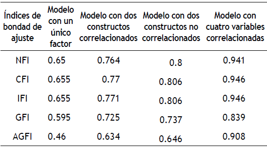 Con respecto al ajuste del modelo, se aplicaron las prue bas GFI y AGFI, como índices de ajuste absoluto, (Kline, 2005; Luna-Cortés, 2019), también se examinaron los ín dices de ajuste incremental. Estos índices no utilizan Chi-cuadrado en su forma cruda, sino que comparan el valor de Chi con un modelo de referencia. La investigación normal mente incluye NFI y CFI (Kline, 2005).