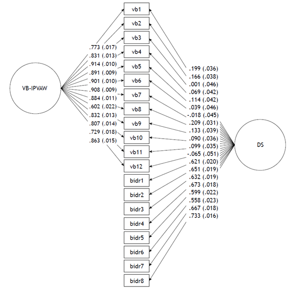 Nota: VB-IPVAW: actitudes de culpabilización de la víctima. DS: Deseabilidad Social. Vb: ítem de la escala VB-IPVAW. Bidr: ítem del BIDR-16. Entre paréntesis: error estandarizado de los parámetros.