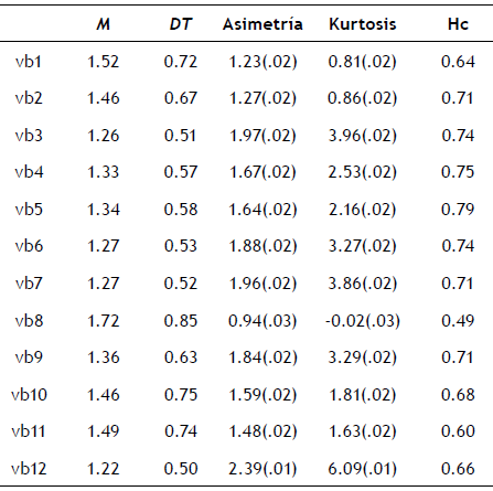 El análisis descriptivo de los ítems mostró que la mayoría de ellos presentaron medias en torno a 1.40, con desviacio nes típicas entre 0.50 y 0.85, indicando que la mayoría de los participantes escogieron las categorías de respuesta de desacuerdo (tabla 1). Esto se ve asimismo reflejado en los estadísticos de asimetría y kurtosis, que muestran una distribución de los ítems moderadamente desplazada a la izquierda y ligeramente apuntada. Los índices de homoge neidad corregida fueron altos, reflejando una estrecha rela ción entre cada ítem y el resto de la escala.