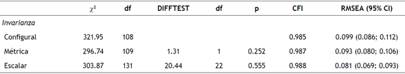 A continuación, se examinó la invarianza factorial de la escala entre géneros (i.e., hombres y mujeres), con una segunda muestra independiente. Los resultados mostraron que los niveles de invarianza configural, métrica y escalar pueden mantenerse entre géneros (tabla 2). Esto indica que hombres y mujeres conceptualizan el constructo de la mis ma manera, que interpretan los ítems de forma similar, y que un mismo patrón de respuestas da las mismas puntua ciones factoriales en ambos grupos.