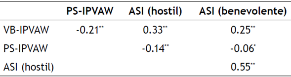 PS-IPVAW: Escala de Gravedad Percibida de la VPM. ASI: Inventario de Sexismo Ambivalente. *: p < .05, **: p < .001.