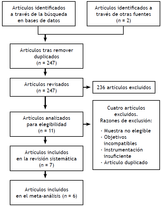Se calculó el tamaño de efecto a través del modelo de efectos aleatorios con el método de máxima verosimilitud restringida (REML). Para estimar la heterogeneidad entre los estudios se calculó la prueba Q y el índice I2 (alta heterogeneidad I2 = 98.51 %, P <.0001). Se analizaron los moderadores del tamaño del efecto mediante análisis de meta-regresión para las variables continuas y análisis de varianza (ANOVA) para las variables cualitativas.