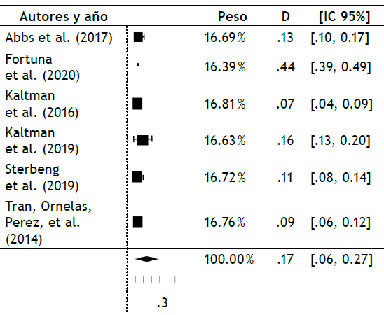 Los tamaños de efecto y resultados de los estudios primarios (Tabla 4) se combinaron y analizaron utilizando un modelo de efectos aleatorios con estimador de máxima verosimilitud restringida, cada resultado con intervalo de confianza (IC) en 95 %.