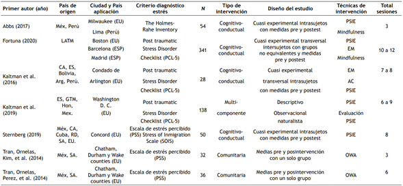 Por último, se identificaron cinco artículos de intervención con muestras menores a 55 migrantes, lo que demuestra una de las principales limitaciones citadas por los autores debido a la inviabilidad de la generalización de resultados (Abbs et al., 2017; Kaltman et al., 2016; Sternberg et al., 2019; Tran, Ornelas, Kim et al., 2014; Tran, Ornelas, Perez et al., 2014).