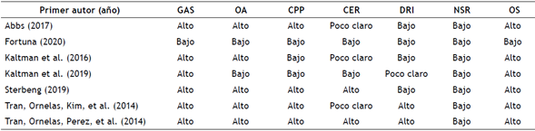 Nota: GAS = generación aleatoria de secuencia; OA = ocultación de asignación; CPP = cegamiento de participantes y de personal; DRI = datos de resultado incompletos; CER = cegamientos evaluadores de resultados; NSR = notificación selectiva de resultados; OS = otros sesgos.