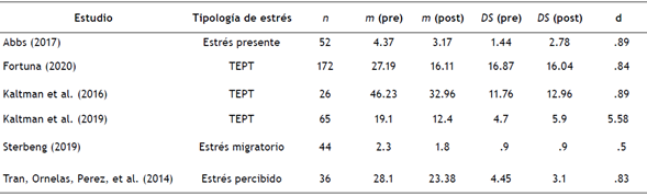 Nota: m (pre) = media pretest; m (post) = media postest; DS (pre) = desviación estándar pretest; DS (post) desviación estándar postest; d = Cohen; TEPT = trastorno de estrés postraumático