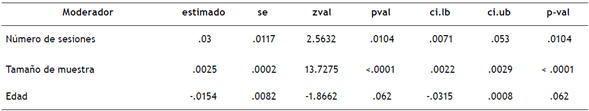 Se analizaron además los posibles moderadores del tamaño de efecto mediante una meta-regresión para las variables continuas y un análisis de varianza (ANOVA) para las variables categóricas, allí las variables numéricas moderadoras son las únicas significativas para el número de sesiones (β = .030, p = .010) y para tamaño de la muestra (β = .002, p = <.0001) (Tabla 5).