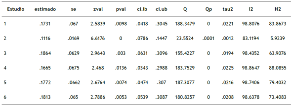 Nota: Estimado = tamaño de efecto; se = error estándar; zval = valor de Z; pval = significación; ci.lb = intervalo de confianza inferior; ci.ub = intervalo de confianza superior; Q = heterogeneidad; Qp = estadístico heterogeneidad asociada a un valor p < 0.0001; tau2 = estimado total heterogeneidad; I2 = variabilidad; H2 = variabilidad muestral.