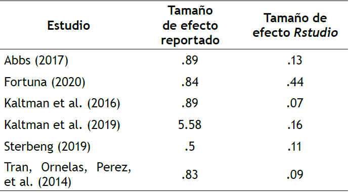 En algunos resultados del presente meta-análisis, se discuten algunos aspectos: en primer término, se encontró que el trabajo de intervención de Fortuna et al. (2020) obtuvo los mejores resultados en relación con la efectividad, diseño, formato y valoración de los sesgos de intervención; no obstante, el resultado del tamaño de efecto a través de Rstudio señala un tamaño de efecto medio (d = .44) en contraste con el tamaño de efecto alto (d = .84) reportado en el estudio primario. Cabe señalar que los tamaños de efecto se valoran de acuerdo con los criterios de la d de Cohen (Gravetter & Wallnau, 2013). En segundo lugar, Kaltman et al. (2016) reportaron un tamaño de efecto alto (d = .84); sin embargo, a través del meta-análisis, se encontró un tamaño de efecto bajo, lo que contradice los resultados en el estudio primario. Es importante anotar que los trabajos realizados por el grupo de investigación de Kaltman y colaboradores (Kaltman et al., 2016; Kaltman et al., 2019) fueron los mejor valorados en cuanto al número de sesgos de intervención, solo después del trabajo de Fortuna et al. (2020). En relación con ello, en Kaltman et al. (2019) también se encontraron diferencias importantes en los resultados reportados. Por un lado, los autores reportaron un tamaño de efecto muy alto (derivado de la metodología de análisis y comparación empleada) en contraste con el tamaño de efecto bajo (d = .16) expuesto a través de Rstudio. Del mismo modo, Abbs et al. (2017) y Tran, Ornelas, Perez, et al. (2014) reportaron tamaños de efecto por encima de d = .80, concluyendo un tamaño de efecto grande en sus programas de intervención. Empero, ambos resultados fueron distintos en contraste con lo realizado a través de Rstudio, pues se encontró un tamaño de efecto bajo para Abbs et al. (2017) (d = .13) y para Tran, Ornelas, Perez, et al. (2014) (d = .09). Por último, en relación con el estudio de Sternberg et al. (2019) señalaron un tamaño de efecto medio (d = .50); no obstante, el meta-análisis señaló un tamaño de efecto bajo (d = .11) manifestando una vez más las discrepancias entre los resultados del tamaño de efecto de los estudios primarios y lo valorado a través de Rstudio y el meta-análisis.
