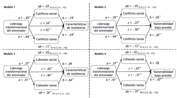 Se realizaron cuatro SEM para testear las relaciones entre las variables analizadas, con el factor del liderazgo transformacional del entrenador como variable indepen diente, los dos factores del conflicto intragrupo (social y tarea) y de la cohesión de grupo (social y tarea) como va riables mediadoras, y las características de resiliencia y la vulnerabilidad bajo presión como variables dependien tes. En la figura 1, se muestran los resultados estandari zados de los cuatro modelos. En primer lugar, el liderazgo transformacional del entrenador predijo positivamente las características de resiliencia (ruta c´; Modelo 1, b = ,34, p < .001; Modelo 3, b = .20, p < .001) y negativamente la vulnerabilidad bajo presión (ruta c´; Modelo 2, b = -.27, p < .01; Modelo 4, b = -.29, p < .001). En segundo lugar, el liderazgo transformacional del entrenador en el modelo 1 y 2 predijo negativamente el conflicto social (ruta a; b = -.39, p < .001) y tarea (ruta a; b = -.44, p < .001), y en el modelo 3 y 4 predijo positivamente la cohesión social (ruta a; b = .37, p < .001) y tarea (ruta a; b = .41, p < .001). En tercer lugar, en el modelo 1 y 2, el conflicto social y tarea predijeron ne gativamente las características de resiliencia (ruta b; bsocial = -.19, p < .05; btarea = -.24, p < .01) y positivamente la vulne rabilidad bajo presión (ruta b; bsocial = .26, p < .01; btarea = .30, p < .001). Por su parte, en el modelo 3 y 4, solo la cohesión tarea predijo positivamente las características de resilien cia (ruta b; b = .64, p < .001) y negativamente la vulnera bilidad bajo presión (ruta b; b = -.47, p < .001). Finalmente, al prestar atención al modelo 1, el conflicto tarea tuvo un efecto indirecto significativo en la relación entre el lideraz go transformacional del entrenador y las características de resiliencia (ruta ab, b = .11, p < .01, 95 % CI (.03, .19)). Al prestar atención al modelo 2, tanto el conflicto social como el conflicto tarea tuvieron un efecto indirecto significativo en la relación entre el liderazgo transformacional del en trenador y la vulnerabilidad bajo presión (ruta ab, bsocial = -.10, p < .05, 95 % CI (-.22, -.02); btarea = - .13, p < .001, 95 % CI (-.21, -.07)). Además, en el modelo 3, la cohesión tarea mostró un efecto indirecto significativo entre el liderazgo transformacional del entrenador y las características de re siliencia (ruta ab, b = .26, p < .001, 95 % CI (.17, .36). Igual mente, en el modelo 4, la cohesión tarea mostró un efecto indirecto significativo entre el liderazgo transformacional del entrenador y la vulnerabilidad bajo presión (ruta ab, b = -.19, p < .001, 95 % CI (-.38, -.17)).