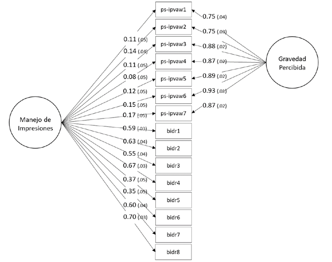 En tercer lugar, se puso a prueba la carga de deseabilidad social de cada uno de los ítems de la escala PS-IPVAW. Para ello se realizó un nuevo AFC utilizando los ítems de la subescala de manejo de impresiones como marcadores de deseabilidad social (Ferrando, 2005). Mediante este procedimiento se plantean dos factores independientes. El primer factor evaluaría el constructo (p. ej., gravedad percibida), y estaría conformado exclusivamente por los ítems de la escala PS-IPVAW. El segundo factor evaluaría la deseabilidad social y en él saturarían tanto los ítems de la escala PS-IPVAW como los marcadores de deseabilidad de la escala de manejo de impresiones. Saturaciones factoriales elevadas en el factor de deseabilidad social permitirían identificar ítems de la escala PS-IPVAW con una mayor carga de este sesgo de respuesta.