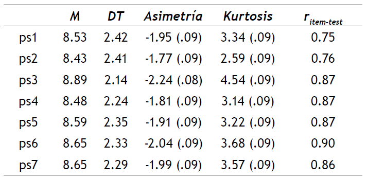 Para adaptar la escala PS-IPVAW al contexto sociocultural ecuatoriano, se examinaron las propiedades psicométricas de la escala mediante los siguientes análisis. Primero se realizó un análisis descriptivo de los ítems, obteniendo la media, desviación típica, estadísticos descriptivos de asimetría y curtosis de cada ítem, así como la correlación entre cada ítem y el resto de la escala.