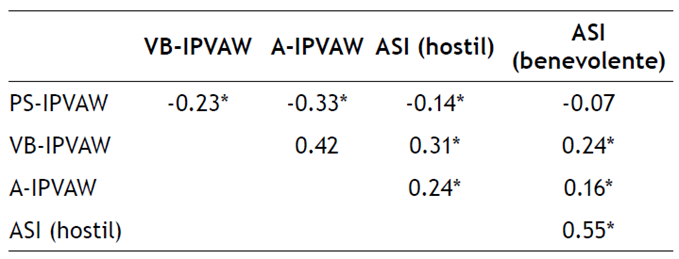 Inventario de sexismo ambivalente (ASI; Expósito et al., 1998; Glick & Fiske, 1996). Esta escala posee 22 ítems con un formato de respuesta tipo Likert de cinco puntos (0 = “totalmente en desacuerdo”, 5 = “totalmente de acuerdo”). Se compone de dos factores: sexismo hostil, que se define como una actitud de discriminación hacia la mujer debido a su supuesta inferioridad en relación al hombre (p. ej., “Cuando las mujeres son vencidas por los hombres en una competencia justa, generalmente ellas se quejan de haber sido discriminadas”) y sexismo benevolente, definido como una actitud de condescendencia que considera a las mujeres de forma estereotipada y necesitadas de la protección de los hombres (p. ej., “Las mujeres, en comparación con los hombres, tienden a tener una mayor sensibilidad moral”). Este instrumento se ha relacionado con la atribución de responsabilidad, la culpabilización a la víctima y la aceptabilidad de VPM (Lila et al., 2014; Martín-Fernández, Gracia & Lila, 2018; Villagrán et al., 2020, 2022). La consistencia interna de la escala completa (ωtotal = .88) y de ambas subescalas fue buena en la muestra general (a = .84 y ωtotal = .86 para sexismo hostil, a = .77 y ωtotal = .73 para sexismo benevolente).