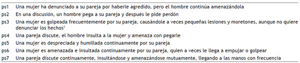 Gravedad percibida de la VPM (PS-IPVAW; Martín-Fernández et al., 2022a). Esta escala plantea siete escenarios de VPM (e.g., “Una pareja discute continuamente, insultándose y amenazándose mutuamente, llegando a las manos con frecuencia”). Los participantes evaluaron la gravedad de cada escenario por medio de una escala de respuesta tipo Likert de diez puntos (1 = “nada grave”, 10 = “extremadamente grave”). La escala PS-IPVAW ha sido validada en el contexto sociocultural español, presentando adecuadas propiedades psicométricas (Martín-Fernández et al., 2022a). Esta medida se ha relacionado con la aceptabilidad de la VPM, la disposición a intervenir en casos de VPM, las actitudes de culpabilización de la víctima en casos de VPM y el sexismo hostil (Gracia et al., 2008; Gracia, García et al., 2009; Gracia et al., 2018; Lila et al., 2010; Martín-Fernández, Gracia, Marco et al., 2018; Martín-Fernández et al., 2022a; Villagrán et al., 2020, 2022). Dos expertos en el campo de la VPM revisaron los enunciados de los ítems, sugiriendo cambios sobre uno de ellos para mejorar su comprensión en el entorno sociocultural ecuatoriano. Los ítems de la versión adaptada al contexto ecuatoriano pueden encontrarse en el Apéndice.