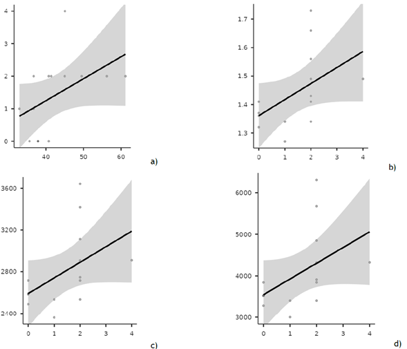a) Correlación entre la ansiedad y la altura de salto; b) Correlación entre la ansiedad y la velocidad de salto; c) Correlación entre la ansiedad y la fuerza de salto; d) Correlación entre la ansiedad y la potencia de salto. Correlación: Rho de Spearman (p ≤ .05).