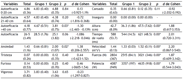 Tabla 2 Datos descriptivos de las variables de autoeficacia, estado de ánimo y CMJ y comparativa entre grupos