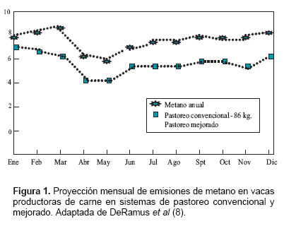 La eliminación de metano vía eructo en el ganado inicia aproximadamente a las cuatro semanas de vida, cuando los alimentos sólidos empiezan a ser retenidos en el retículo-rumen, aumentándose la fermentación y la producción de gases a medida que el retículo-rumen se va desarrollando. Se considera que en sistemas de producción de alta tecnificación la producción anual de metano en animales adultos está entre 60 y 126 kg. (13). DeRamus et al (8), igualmente reportan en sus investigaciones, que las emisiones anuales de metano por novillas de carne en pastoreo estuvieron entre 32 y 83 kg. y entre 60 y 95 kg. para vacas adultas, que pastoreaban diferentes tipos de praderas. El dato más alto en cada tipo de animal, corresponde a gramíneas de baja calidad nutricional, con sistemas de pastoreo continuo y baja disponibilidad forrajera, mientras que los datos más bajos corresponden a praderas mejoradas, a sistemas de pastoreo rotacional, fertilización y con alta disponibilidad de forraje (véase Figura 1). En estos reportes, se observa, que de acuerdo a las condiciones de la dieta, las emisiones de metano pueden variar ampliamente, indicando que las características nutricionales de la pastura tienen un efecto marcado en la producción de dicho gas.