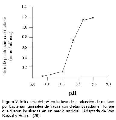 Un factor importante cuando se relaciona la producción de metano con el metabolismo ruminal, es el efecto del pH. Así, Van Kessel y Russell (28) señalan, que cuando bacterias provenientes de vacas alimentadas con forraje fueron incubadas en un medio basal que contenía 100 mM de acetato (pH 7.0), el hidrógeno y el dióxido de carbono se convirtieron en metano, pero la tasa de producción de este fue dependiente del pH. Estos autores observaron que la producción de metano disminuyó drásticamente a pH menores a 6.5, y virtualmente no se produjo a pH menores a 6.0 (véase Figura 2).
