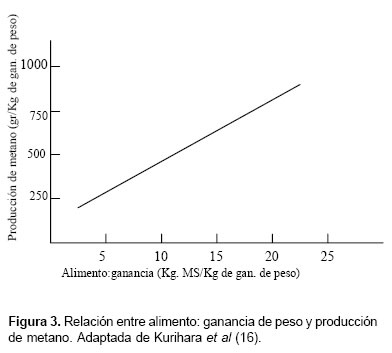 Kurihara et al (16) reportan que la producción de metano (gr/día) en ganado alimentado con Rodhes (Chloris gayana) fue mayor que en los animales alimentados con Ángleton (Dichantium aristatum) y aun mayor que los alimentados con dieta alta en grano. Siendo estos dos tipos de forrajes característicos de zonas tropicales, la producción de metano es mayor y la utilización de la energía menor que lo observado en los forrajes de zonas templadas. Estos aspectos en la dieta con alto grano, fueron similares a los reportados por diversos autores en dietas tradicionales de de zonas templadas. En este trabajo se presume que la alta producción de metano en forrajes tropicales está relacionada con los altos niveles de fibra y de lignina, a los bajos niveles de carbohidratos solubles y a su baja digestibilidad.