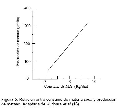 Donde CH4 está en Megajoules/día y los residuos solubles, hemicelulosa y celulosa en Kkg/día. Sinembargo, Johnson y Johnson (13) anotan que es poco probable que una ecuación simple basada en las características del alimento tenga una predicción exacta de la producción de metano bajo condiciones perturbadoras en campo. Van Soest (29) señala que las nuevas ecuaciones implementadas en la estimación de producción de metano indican que la digestibilidad del carbohidrato (hemicelulosa más que almidón) tiene efecto sobre la producción de metano.