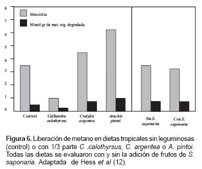 Hess et al (12), señalan que los taninos presentes en muchas leguminosas, como Calliandra calothyrsus, pueden estar asociados con la reducción en la producción de metano, hasta en un 50%, respecto a la dieta tradicional de pasto solo. Pero esto no está asociada a todas las leguminosas de potencial forrajero en el trópico, así, estos autores reportan que especies como Cratylia argentea y Arachis pintoi incrementaron los niveles de metano, hasta 3-4 veces la cantidad determinada en dietas con solo pasto (véase Figura 6).