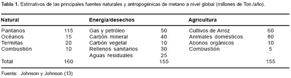 espera que el metano cause cerca del 15-17% del Tabla 1), pero el grado de incidencia y la proporción calentamiento global. Actualmente se tienen definidas exacta de muchas de estas fuentes no son claras las fuentes de metano causantes de este efecto (véase (13)