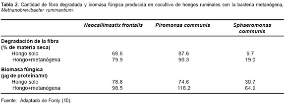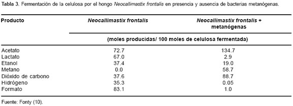 Diversos autores citados por Fonty (10) y Dehority y Tirabasso (7), mencionan un sinergismo entre algunos hongos y bacterias metanógenas, señalando que estas asociaciones incrementan los hongos y la tasa de hidrólisis y degradación de la celulosa (véase Tabla 2). También se ha encontrado que esta asociación incrementa la producción de acetato a expensas de la reducción de lactato y etanol (véase Tabla 3)